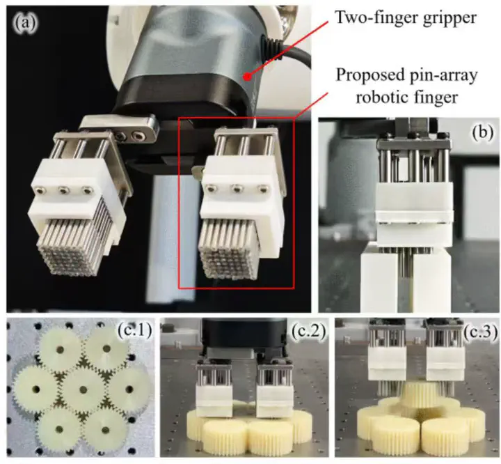 (i) the limited inter-object clearance leaves insufficient space for conventional gripper fingers to approach and wrap the target object without collisions, and (ii) perception-induced position uncertainty makes it difficult to place the fingers precisely into such narrow spaces. Thus, in this letter, we propose a novel robotic finger based on pin-array mechanisms to passively adapt to object clearance between adjacent objects and tolerate pose uncertainty. The tiny pins can be inserted into constrained spaces and thus construct stable grasping pairs. Unlike conventional pin-array mechanisms used in gripper design, the proposed approach utilizes the pin-array for finger design, enabling a gripper equipped with a pair of these fingers to pick objects in significantly narrower spaces than conventional grippers. This gripper also inherits the advantages of the pin-array mechanisms to facilitate shape and error adaptation. Furthermore, we conducted finite element analysis (FEA) to validate the structural design and explore the miniaturization limit, and explain the planning method for autonomous operation. The experiments quantitatively explored the adaptable clearance and validated the feasibility and robustness in real scenarios.
