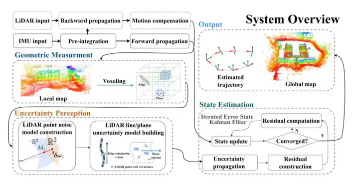 System overview of LIO-GUM. The system mainly contains geometric-uncertainty model construction, geometric residual computation, and state estimation.